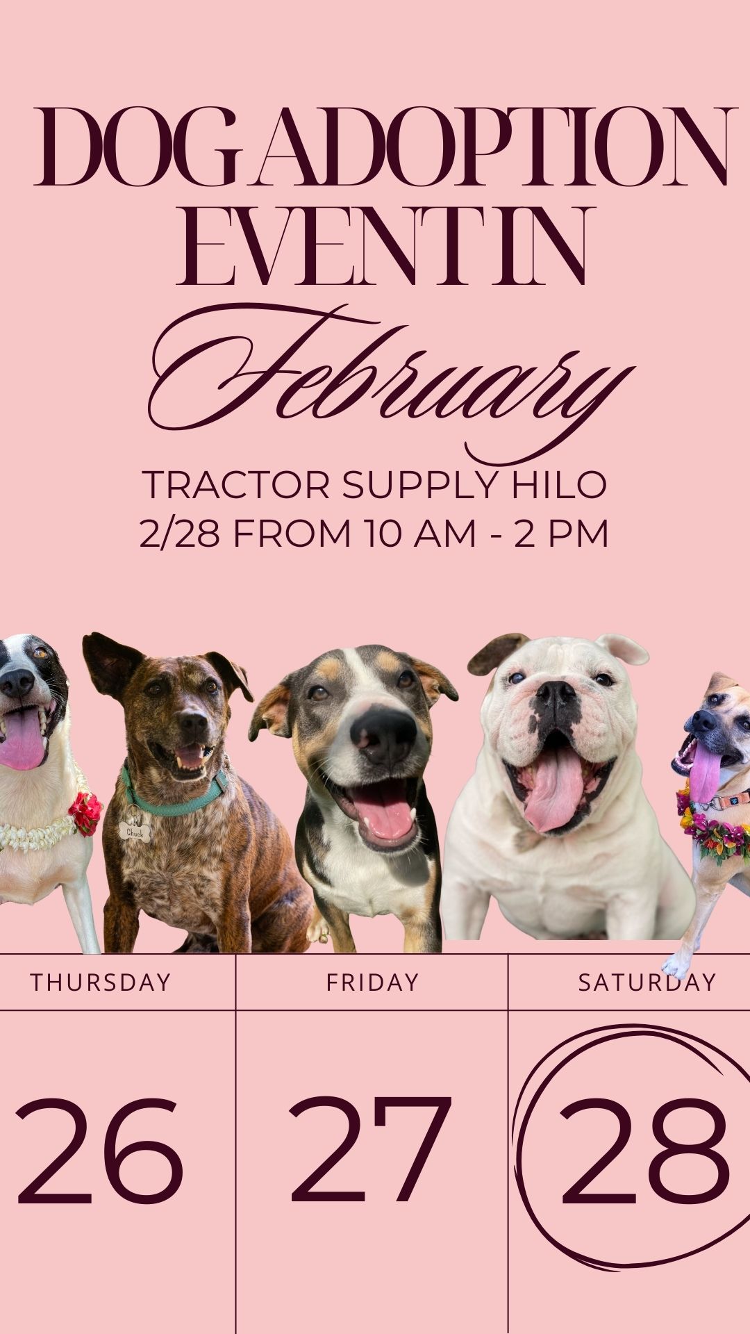 Get ready for tail wags and happy paws! Aloha ʻĪlio Rescue is bringing adorable adoptable dogs to Tractor Supply in Hilo on Saturday, February 28 —stop by to meet your new best friend, learn about fostering, or just say hi and get some puppy love! 111 Puainako St #0300J, Hilo, HI 96720.